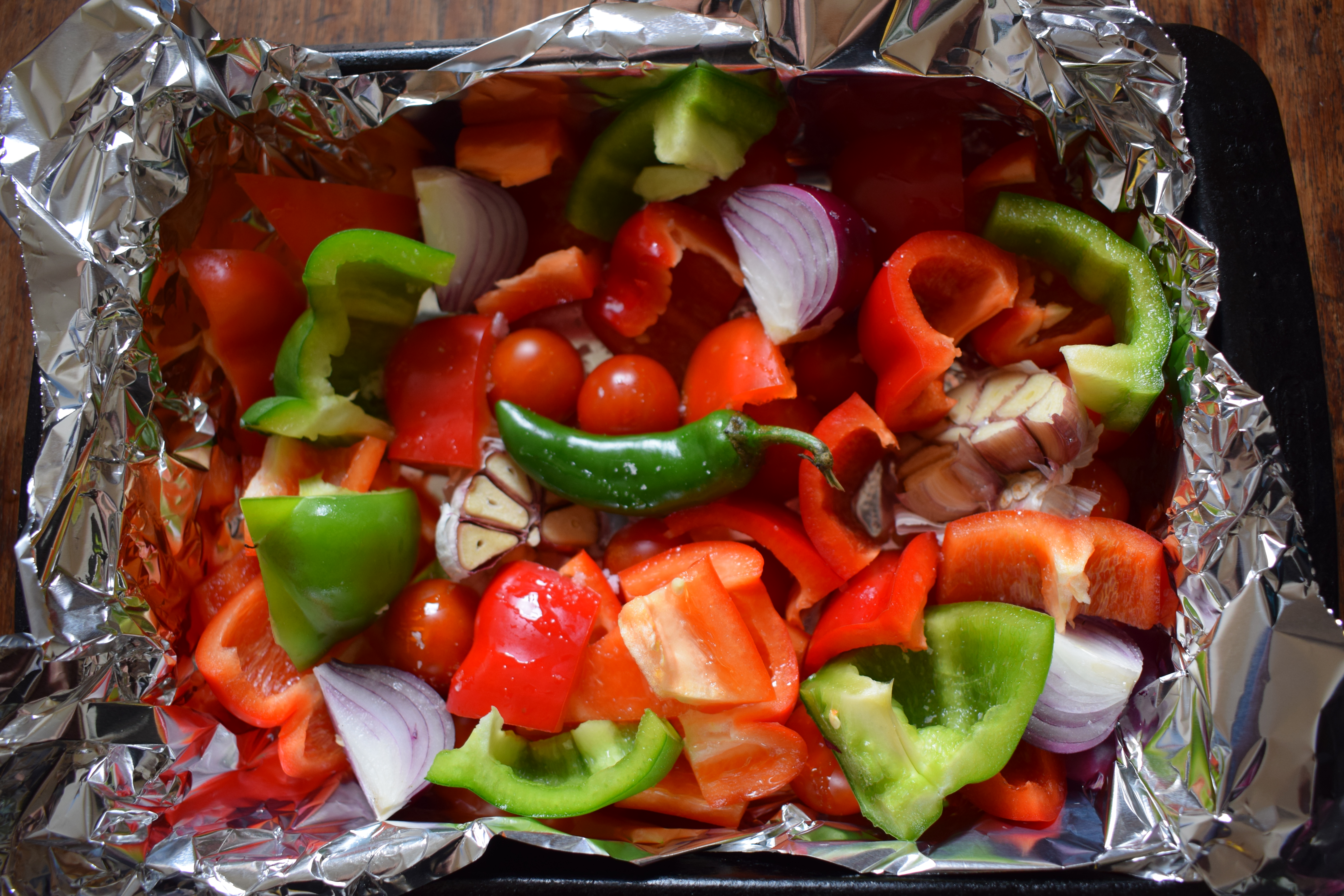 Red peppers, onions, chilli, tomato and garlic, ready to roast