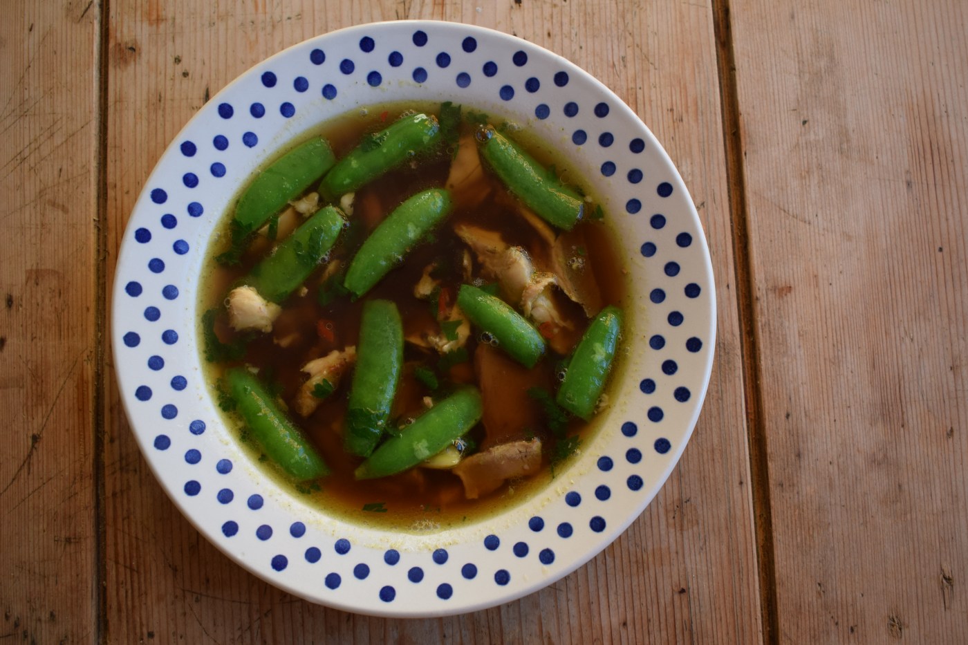 The leftover scraps from a roast chicken carcass (this is definitely the best kind to use – I find cooking chicken fresh from breast or thigh is just a bit flavourless – you’re looking for all those delicious salty umami flavours that come from the roasting process)